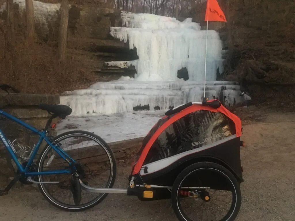 We also love renting the Quadicycle or kayaks at the Creve Coeur Canoe Rental shop. There are three playgrounds, a ropes course and the unpaved Bootlegger’s trail in the upper part of the park. In addition, Dripping Springs waterfall is a sight to see after a good rain or in the winter with lots of icicles (see picture below of the frozen waterfall)! Basically, I’m obsessed with this area and it is a huge bonus to be a good spot for family-friendly biking too!