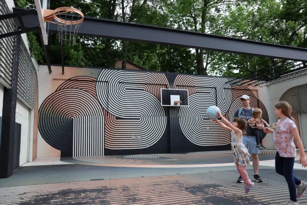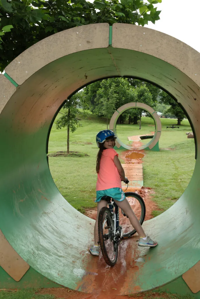 After the trails, we biked 3 miles north to Bentonville Bike Playground. This opened in 2016 and is a one acre bike playground for all ages. There are tunnels, dirt trails and a pump track. They also had bike stations, which Mark used to tighten our daughter’s bike handlebars. We saw bike stations pretty much everywhere we visited on this trip, which was so great! From there, we rode our bikes on the Razorback Greenway to the Crystal Bridges Museum Art Trail.