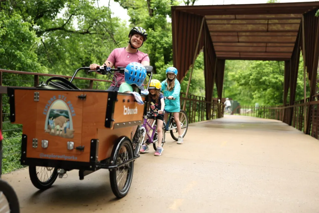 The Razorback Greenway is just so scenic with many bridges and streams flowing underneath. And, so many tunnels! Whenever the trail has to go along the street, there is a separate bike lane right next to the road. The rain stopped after 5 miles into our ride and the sun came out. The rest of the ride to Bentonville was great and our girls took turns riding their bikes along the way! So thankful for our Bunch Bike and Radio Flyer for making their trip seamless.