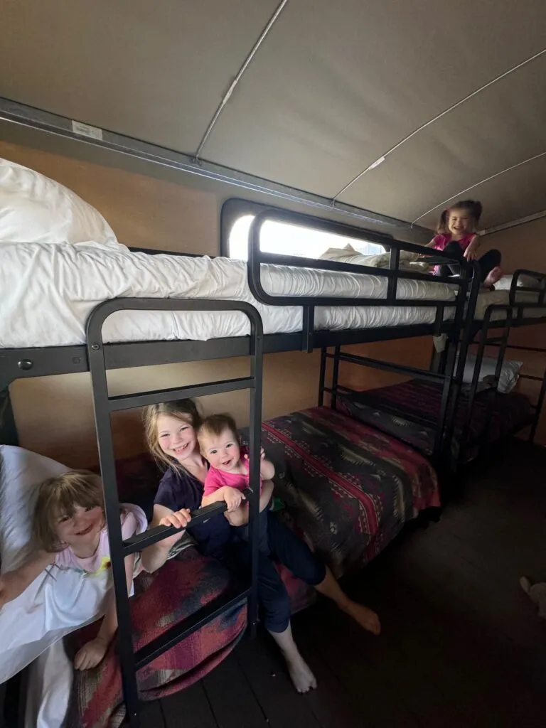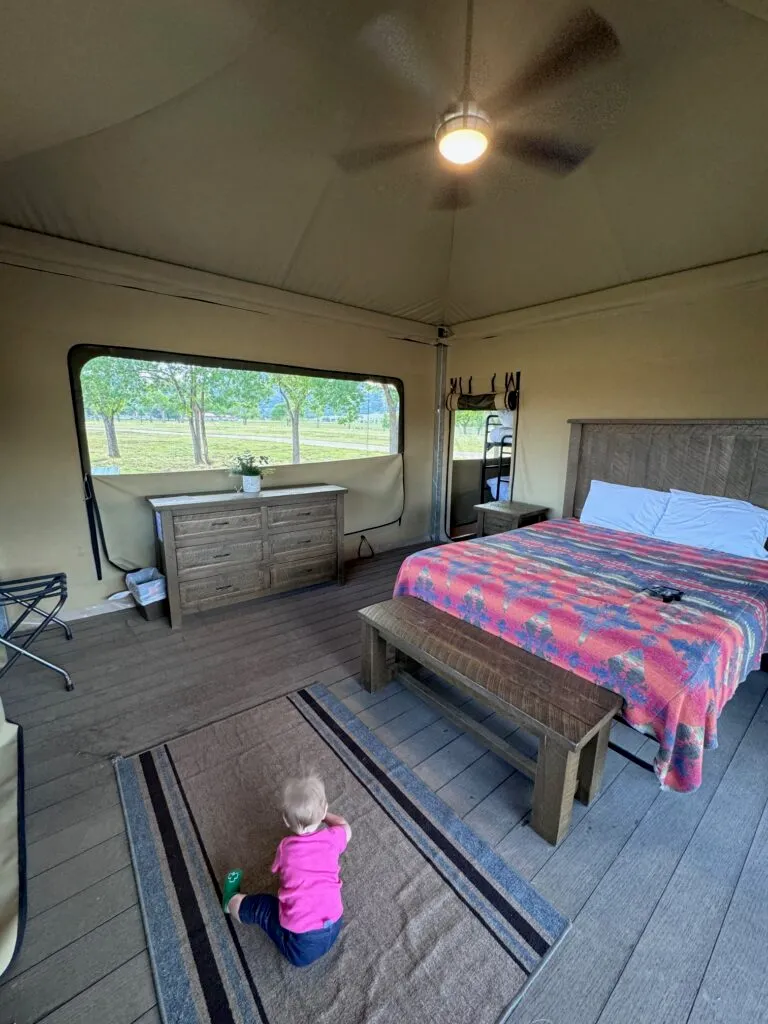 We stayed at one of the glamping tents for the week. There is a queen-sized bed and a separate room with 2 bunk beds (4 twin beds). The beds were super comfy, there was electricity, a ceiling fan and all linens were provided (pillows, sheets and blankets). The main room was spacious enough where we could put a pack n’ play next to our bed (for our 8 month old to sleep in). There were groups of 4 glamping tents facing each other with a gas campfire in the middle. It was really nice to start up quickly for s’mores!