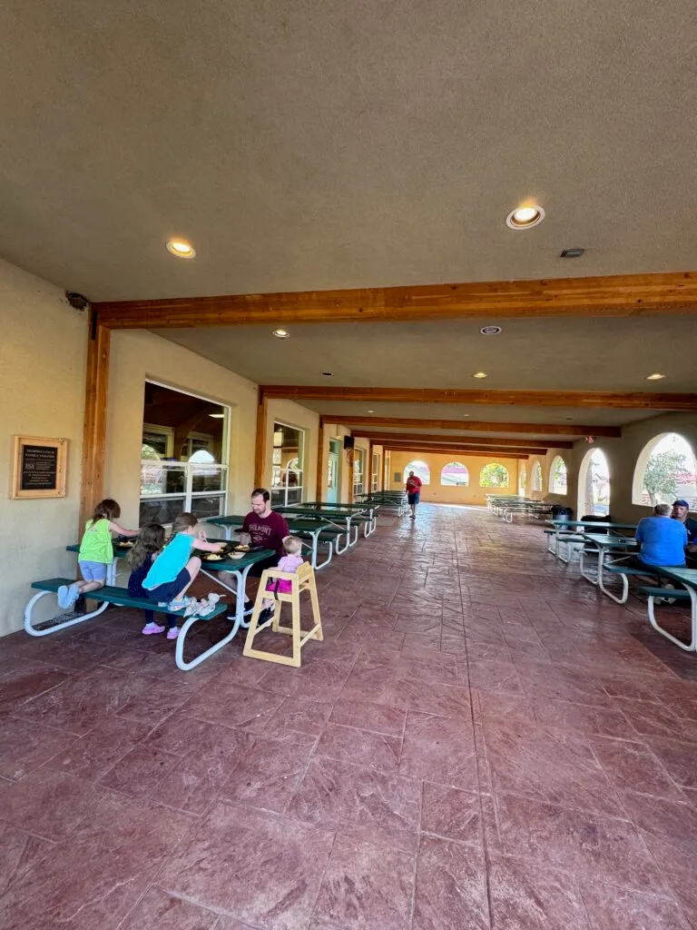Breakfast, lunch and dinner are all included with Family Adventure Camp Philmont. The food is great and they offer kids’ meal options for some days too. For example, there were corn dogs offered one night when there was a more spicy meal offered. There is a large outdoor covered patio or also a larger room indoors to eat. A highlight for my kids were the plethora of drink options from milk to Gatorade to lemonade! High chairs were available as well.