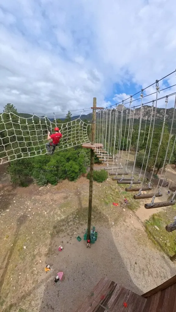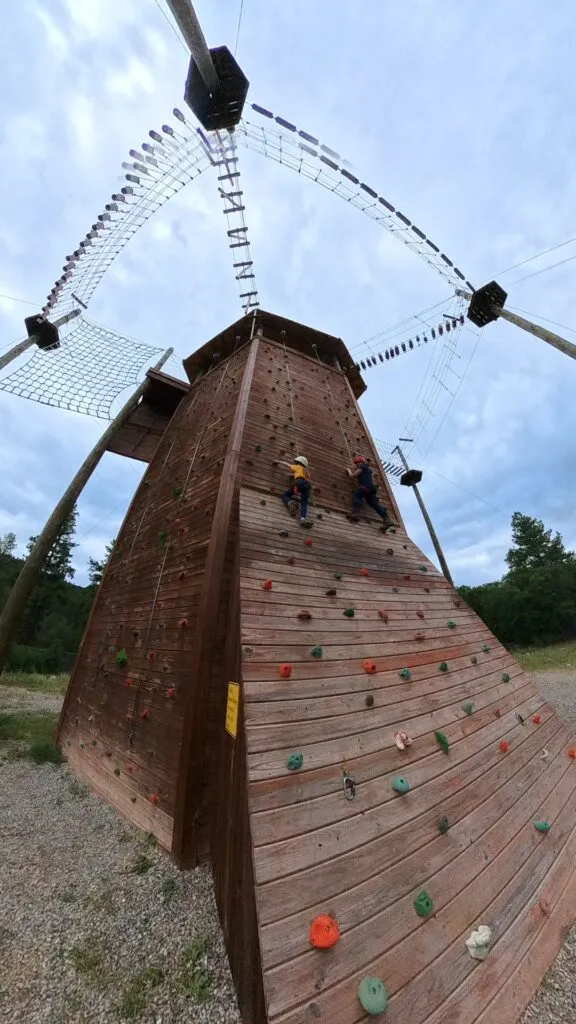 Our 3 older kids tried the climbing tower (auto belay). There was one section with a slight incline, which was perfect for new climbers. The high ropes course is for ages 11 and up, so my husband and I adventured up there. This was something out of my comfort zone (my legs were shaking, ha!), but I loved showing my kids that I can try new things too! Our girls also tried crate stacking while here. You stand on a crate and are handed a second crate. You have to balance and climb onto the new crate without falling! Our 7yo made it to 9 crates (she was attached to a harness to catch her when she fell). I believe the current record is 23 crates!