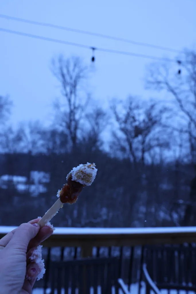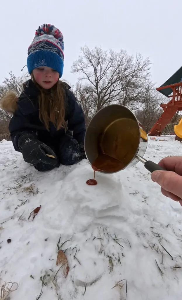 This was a new one for us this year! We heated up maple syrup (or honey with 2 tablespoons of brown sugar). After about 5 minutes (when it was very hot and bubbly), we quick walked outside and poured it on a pile of snow! My girls then took a popsicle stick and touched the mixture. They rolled it around in the snow to make their own candy pop!