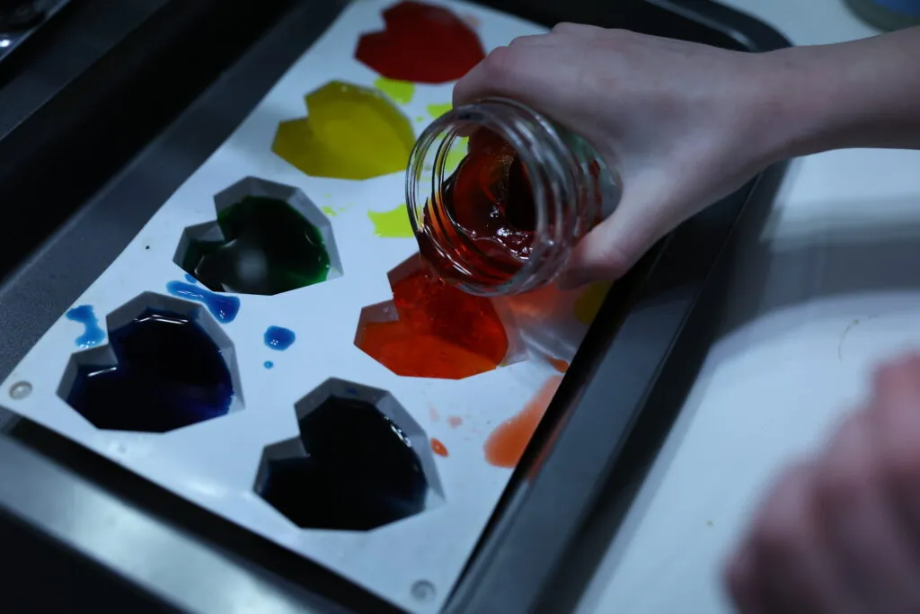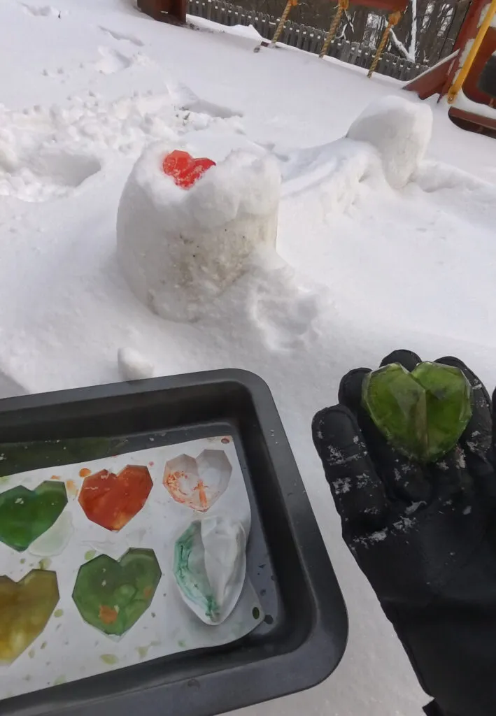 We make different jars of food coloring and water. Then, we poured the different colors into silicone molds. After the hearts froze, we then took them outside to decorate a snow castle in the yard!