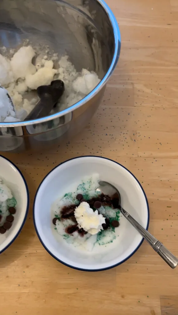 This warms up very quickly when we start mixing things together, so I usually end up refreezing it in our freezer to firm it up before eating. It is not my favorite tasting, ha! But, my girls just love it, so that makes it all worth it!