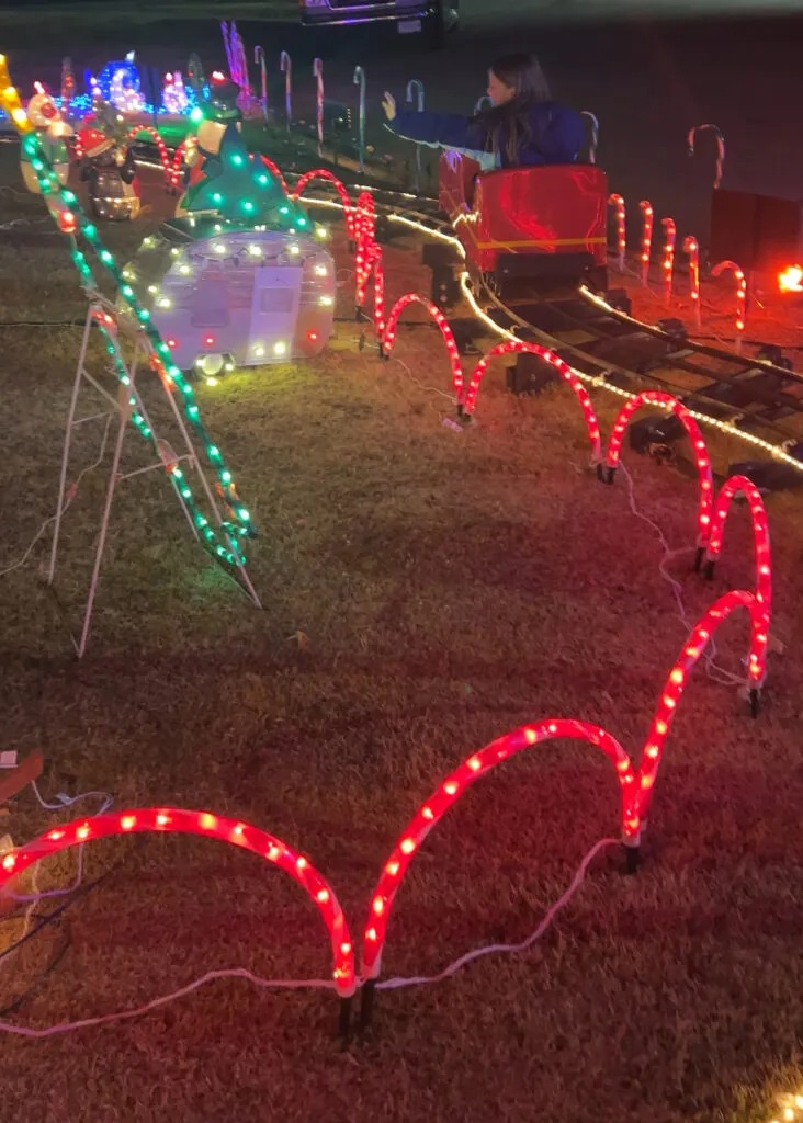 Kids under 100lbs are welcome to take train rides in this front yard on one of the two trains. My kids love this!!